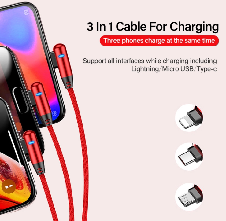 2020 portable 3A 90 degree with LED Light 3 in 1 USB Cable For iphone Type C Samsung super charging data cable